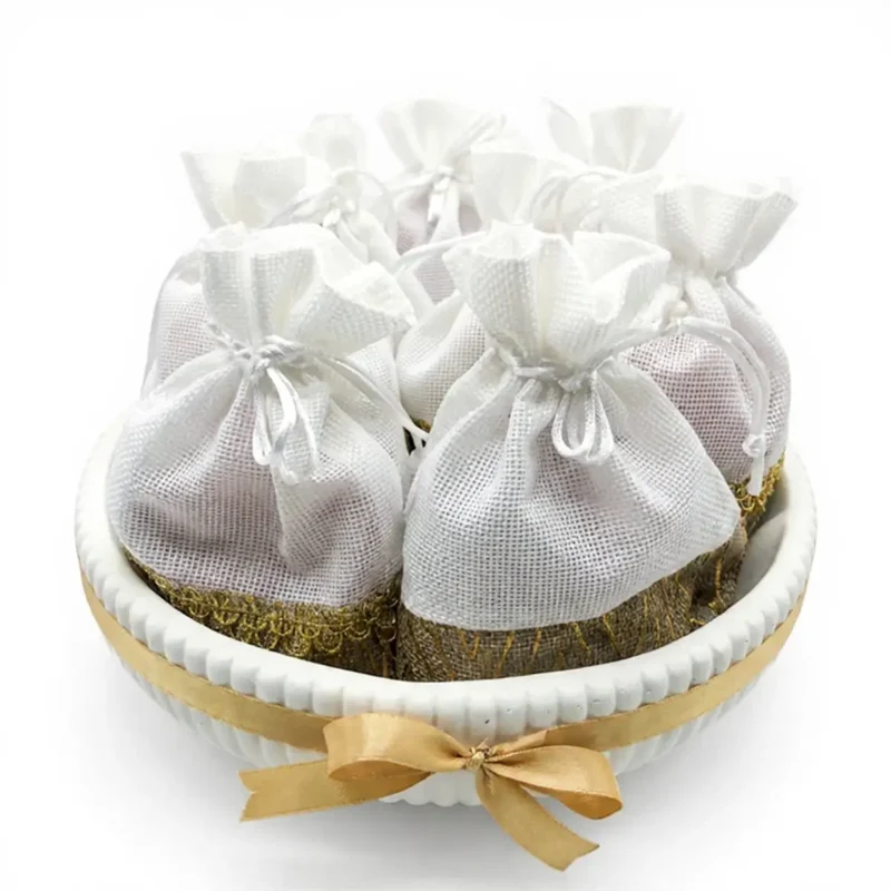 Girgian Bowl is a beautifully arranged Ramadan giveaway set designed for traditional Girgian celebrations. The decorative white bowl, finished with an elegant gold ribbon, is filled with individually wrapped candy pouches ready for distribution. Perfect for welcoming children and guests during Ramadan gatherings while adding a refined festive touch to your décor.