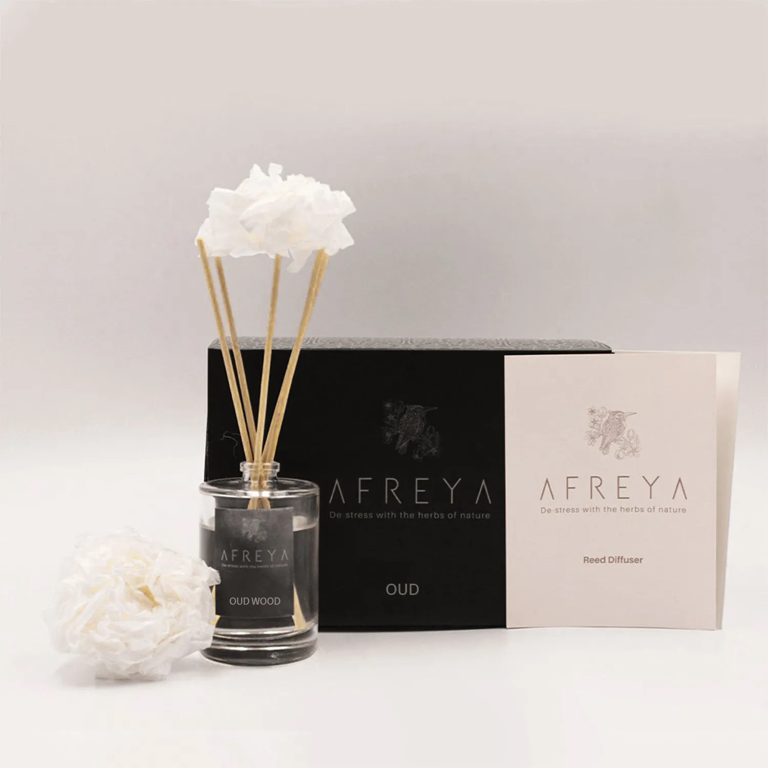 Afreya Reed Diffuser 50ml is perfect for weddings, corporate events, and eid giveaways in Kuwait. each mini diffuser comes with a box, ribbon, and note card. Available in Rose, Jasmine, Lavender, and Oud Wood. Order from 50 to 300 units.